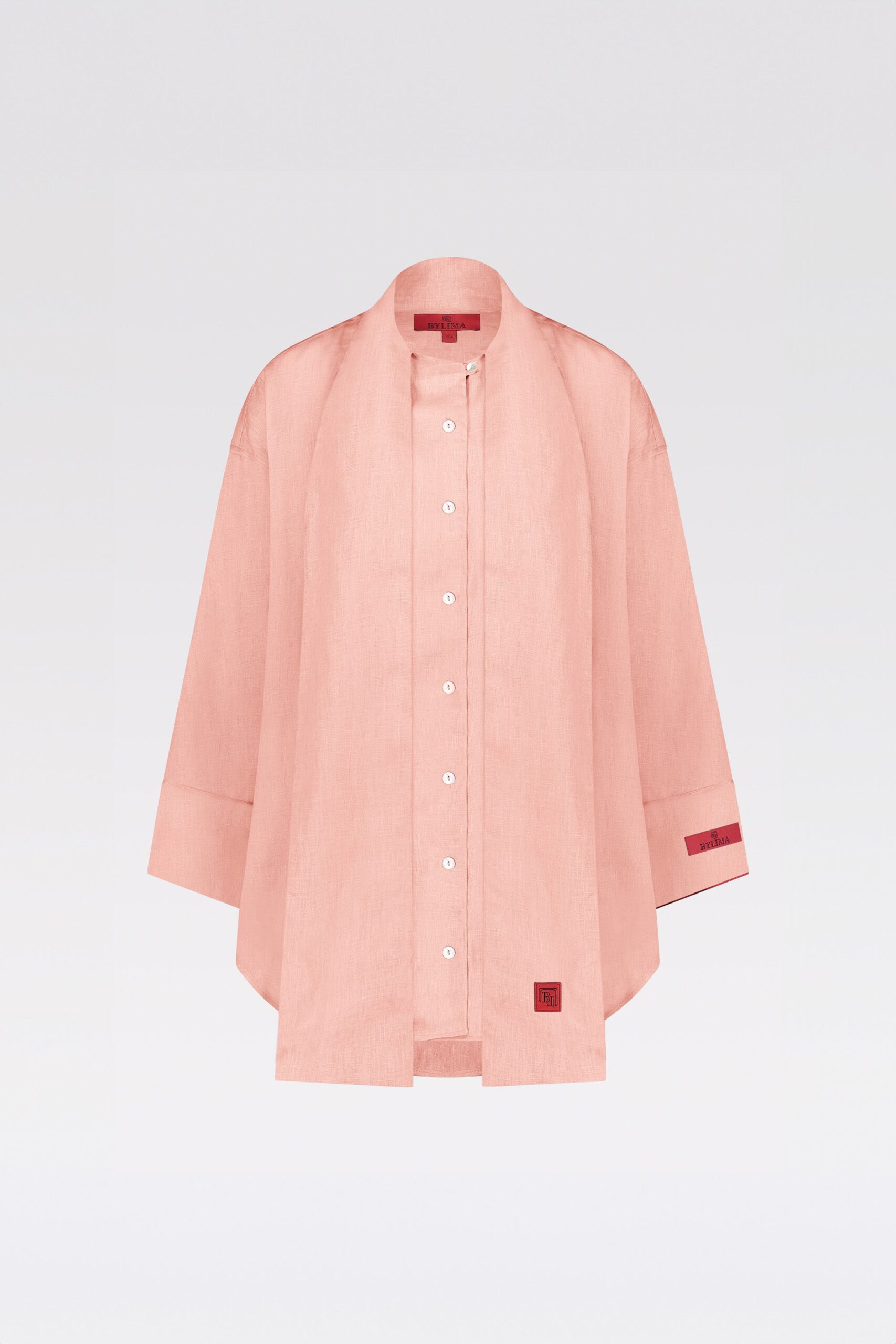 The BYLIMA ‘Linen Blouse’. Crafted from 100% premium linen, this versatile piece offers both style and comfort. Designed to be worn either open as an overshirt or closed for a more polished look. The lightweight and breathable fabric makes it perfect for layering or wearing alone. Adorned with our signature logo, an extra piece of fabric is attached to the collar, offering a unique styling option. Wrap it around your neck to complete the look. The BYLIMA ‘Linen Blouse’ also goes seamlessly with our Comfy Set, creating a relaxed yet refined aesthetic.